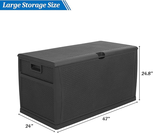 VINGLI Upgraded 120 Gallon Outdoor Storage Box, Lockable Plastic Storage Containers with Lid, Rattan Grain Surface Deck Box Patio Furniture for Garden, Pool, Balcony, Yard (Black)