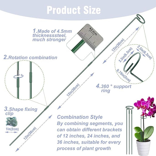 4.5mm Adjustable Length Plant Stake, Assembled (12 or 24 or 36 inch) Outdoor and Indoor Plant Support Poles for Flowers Marigolds Tomatoes Lilies Peonies Roses Daffodils Flower Clips (8 Sets, 32 Pcs)