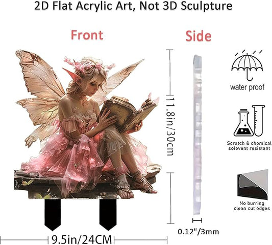 Fairy Garden Stake Decor, 2D Flat Acrylic Fairy Garden Decor Panel, Elf Yard Sign for Outdoor Indoor Yard Lawn Plants Pots, Fairy Backyard Accessories (Pink Fairy Reading a Book)