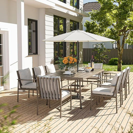HAPPATIO 9-Piece Patio Table and Chairs Set for 8, Aluminum Outdoor Dining Set with Cushions, 8 Dining Chairs, 1 Large Rectangular Table with Umbrella Hole for Lawn, Porch, Backyard, Grey