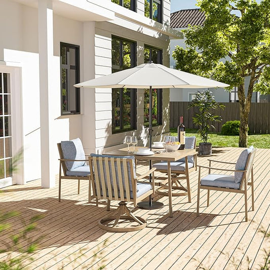HAPPATIO 5-Piece Outdoor Dining Set for 4, Aluminum Patio Dining Set Includes 1 Large Square Table with Umbrella Hole, 2 Swivel Dining Chairs, and 2 Dining Chairs, for Lawn, Porch, Backyard (Grey)