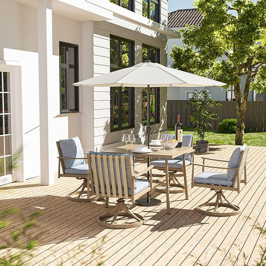HAPPATIO Outdoor Dining Set 5 PCS, Aluminum Patio Dining Set Includes 1 Large Square Table with Umbrella Hole & 4 Swivel Dining Chairs, Patio Furniture Set for Lawn, Porch, Backyard (Brown)
