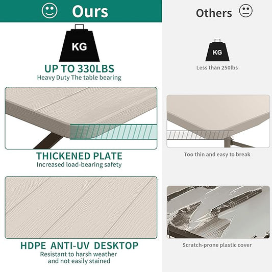 67" Rectangle HDPS Patio Dining Table, Aluminum Outdoor Patio Dining Table with Umbrella Hole, Weather-Resistant for Lawn, Garden, Yard, Poolside and Indoor Use, White & Teak