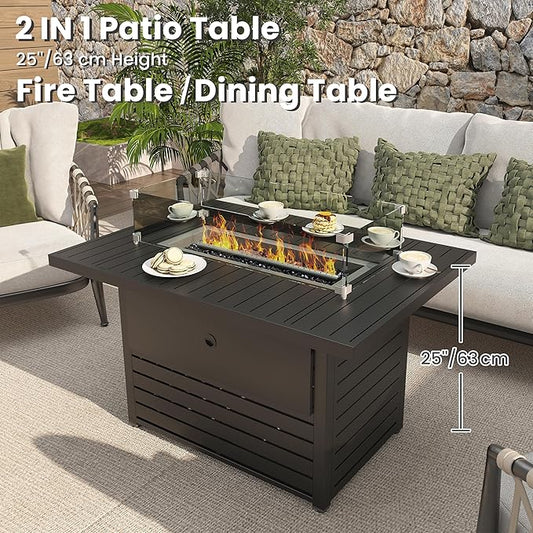 43 Inch Propane Fire Pit Table, 3-in-1 Multi-Use 50,000 BTU Square Gas Fire Pit with Lid & Blue Glass Stones, Steel Tabletop, Adjustable Flame, for Patio, Backyard, Deck, Outdoor Gatherings