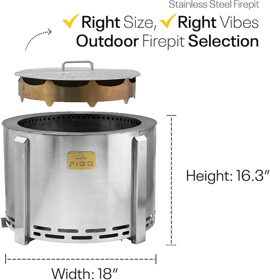 Smokeless Firepit - 18 Inch - Stainless Steel Fire Pit - Wood Fire Pits for Outside with Stand, Removable Ash Rake, Fire Poker & Fire Pit Cover - Smokeless Firepit for Outside, Bonfire, BBQ, Backyard