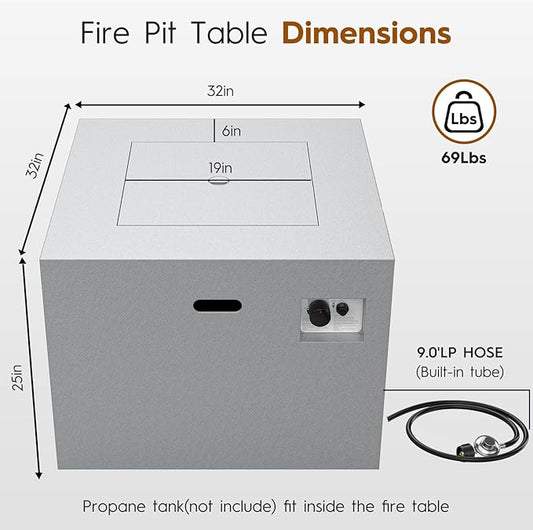 32 Inch Outdoor Fire Pit Table, 50,000 BTU Square Propane Fire Pit with Lid, Lava Rocks, Weatherproof Cover, Alloy Steel Gas Firepit Table for Outside Patio, CSA Certified, Gray