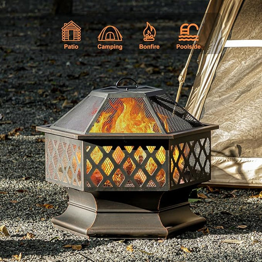 28Inch Outdoor Fire Pit, Hexagon Shaped Wood Burning Firepit for Outside Bonfire, Patio, Backyard and Camping (Antique Bronze)
