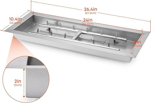 Stanbroil 24" x 8" Upgrade Rectangle Fire Pit Jet Burner Pan, 304 Stainless Steel Natural & Propane Gas Firepit for Outside, High Flame, 90k BTU Max