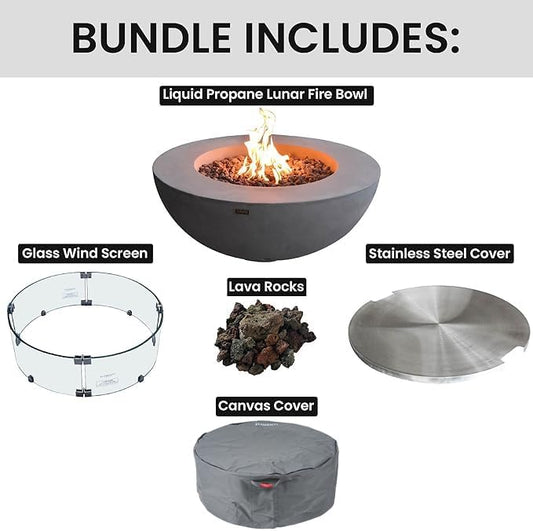 Elementi Lunar Bowl Fire Pit Bundle Outdoor Firepit Set Includes 42” Propane Concrete Firepit, Glass Windscreen, Stainless Steel Cover, Tank Cover, Canvas Cover, Floor Mat, Ice Bucket