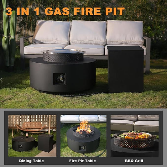 3-Piece Outdoor Fire Pit Table, 32 Inch Propane Fire Table 65,000 BTU Black Round Gas Firepit, Baking Sheet, Wind Guard and 16 inches Tank Side Table for Deck, Backyard and Pool, Black