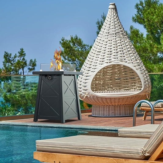 19.5 Inch Steel Fire Table, 40,000 BTU Outdoor Gas Fire Pit, Modern Pattern Patio Column Propane Fire Pit w/Glass Rocks, Cover, Lid, Glass Wind Guard