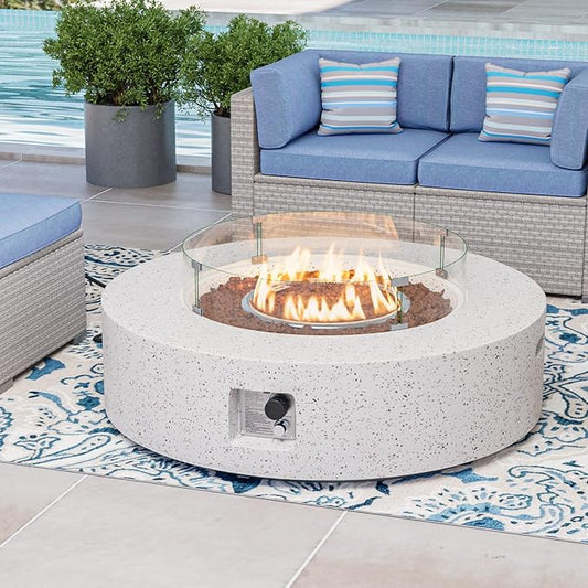 SUNBURY Outdoor Propane Fire Pit, Stone Like Fire Pit Table with Glass Wind Guard, Waterproof Cover, 15000BTUS Small Column Firepit Garden Lighting (Beige)