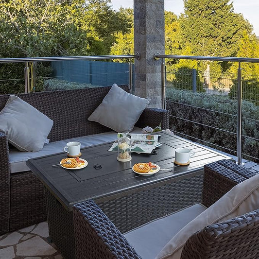 Kozyard Outdoor Patio Propane Gas Fire Pit Table - 50,000 BTU Wicker Design with Aluminum Tabletop, Glass Wind Guard, Clear Glass Rocks, and Slide Out Tank Holder - Ideal Patio Fire Table (Gray)