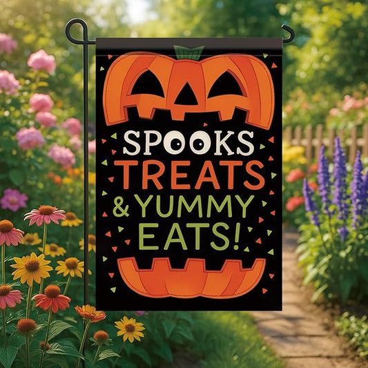 Halloween Garden Flag Spooks Treats & Yummy Eats Pumpkin Flag 12x18 Inch Double Sided Outdoor Yard Banner for Trick or Treat Halloween Decoration Decor