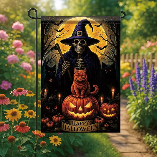 Halloween Garden Flag Witch Skeleton Cat Pumpkin Flag 12x18 Inch Double Sided Outdoor Yard Banner for Trick or Treat Haunted House Halloween Decoration Decor