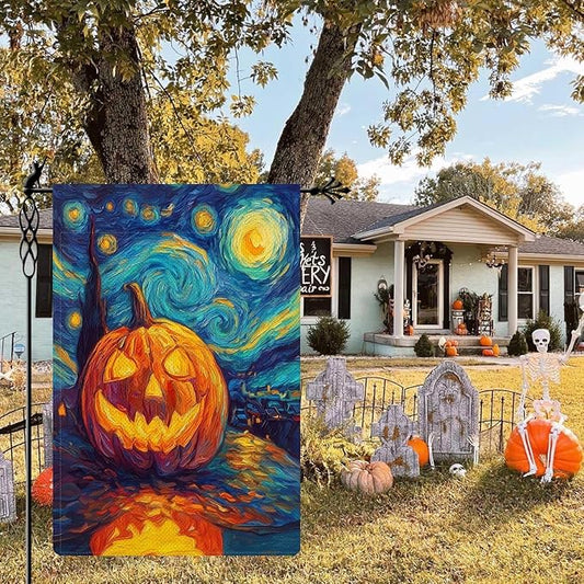 Halloween Garden Flag Pumpkin Garden Flag Van Gogh Garden Flags Arts Starry Night Sky Moon Yard Flag Double Sided Fall Porch Patio Farmhouse Outdoor Yard Decorative 12 x 18 Inch