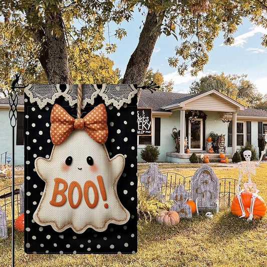 Cute Ghost Garden Flag Halloween Booooo Holiday Garden Flag Vertical Double Sided Rustic Farmland Burlap Yard Lawn Outdoor Decor 12.5x18"