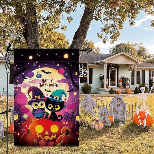 Cute Witch Owl & Black Cat Garden Flag Happy Halloween Flag Full Moonlight Ghost Pumpkin Bats Vertical Double Sided Rustic Farmland Burlap Yard Lawn Outdoor Decor 12.5x18"