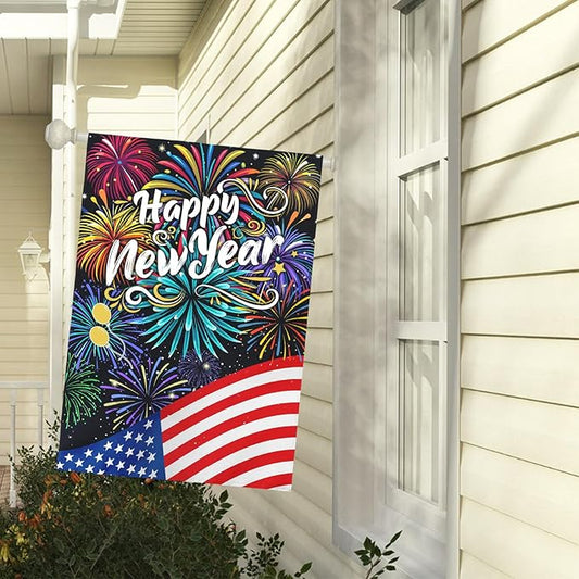 Happy New Year Garden Flag New Year Eve House Banner Double Sided American Flag Fireworks Wall Banners Balloon Holiday Celebration Party Yard Flags for Winter Festival Greetting 28 x 40 Inch