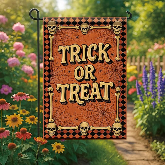 Halloween Garden Flag Trick or Treat Skulls Spider Webs Flag 12x18 Inch Double Sided Outdoor Yard Banner for Halloween Haunted House Spooky Trick or Treat Decoration Decor