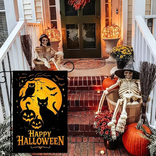 Halloween Garden Flag 12x18 Inch Black Cat Flag Pumpkin Owl Full Moon Double Sided Fall Flags Yard Banner for Outdoor Lawn Porch Garden Holiday Decor