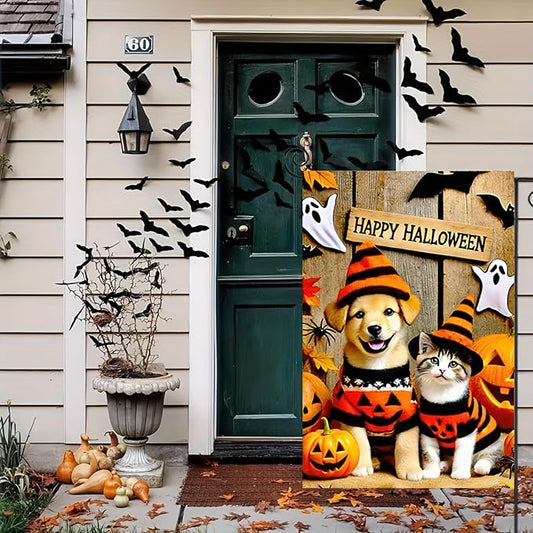 Happy Halloween Garden Flag Double Sided 12x18 Flag Cute Cat And Dog Pumpkin Garden Flag Sweaters And Witch Hats Jack-O'-Lanterns And Ghosts Outdoor Yard Lawn Decoration Banner