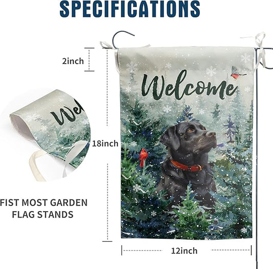 Welcome Winter Garden Flags Black Lab Garden Flag Cardinal Birds on Snowy Pine Tree Flag Labrador Dog Yard Flags for Outside 12x18 Double Sided Christmas Decorative Lawn Flags