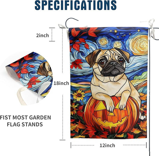 Stained Glass Pug Fall Garden Flag Halloween Pumpkin Yard Signs Autumn Sunflower Thanksgiving Banner for Outside 12x18 Double Sided Small Dog Outdoor Decorative