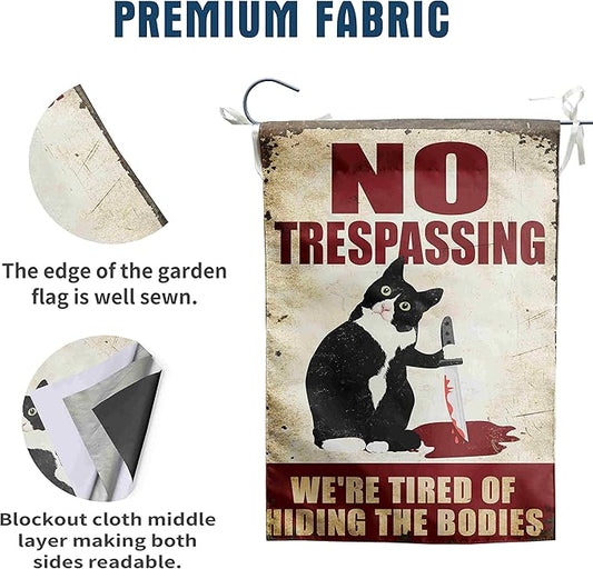 No Trespassing We're Tired of Hiding the Bodies Sign Black Cat Garden Flag Halloween Decorations Outdoor Funny Flag for Yard Party Tombstones Decor 12x18 Double Sided
