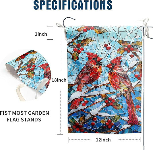 Winter Cardinal Bird Garden Flag for Outside 12x18 Stained Glass Red Birds on Snow Pine Tree Flag Christmas Outdoor Flags Double Sided Welcome New Years Yard Flag