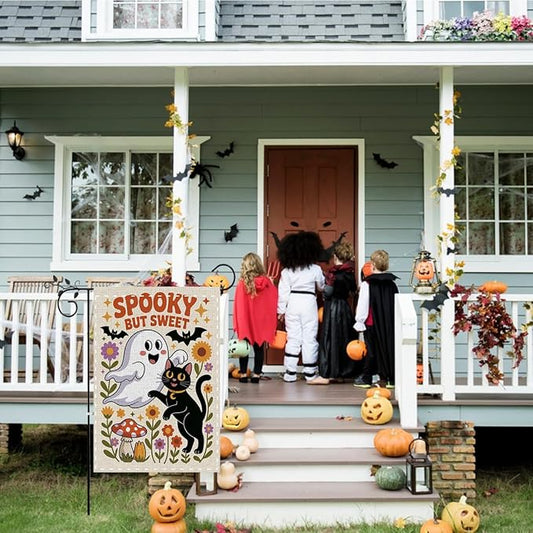 Fokongna Spooky But Sweet Halloween Garden Flags, Cute Ghost Black Cat Halloween Decor Flag, 12x18 Inch Burlap Vertical Double Sided Flags, for Home Yard Outside Decorations