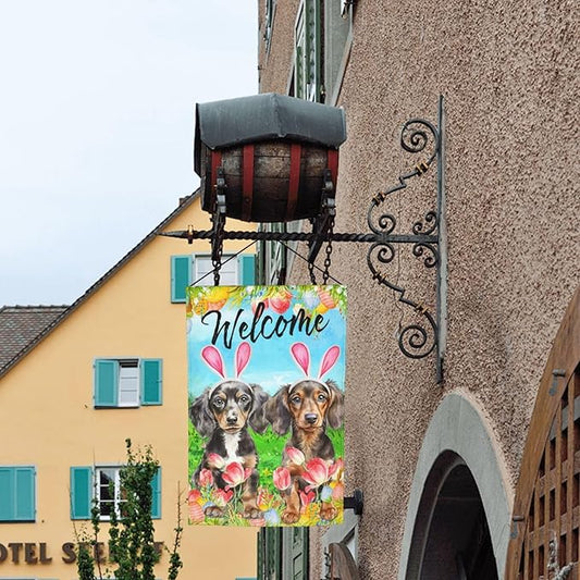 Dachshund Dog Bunny Cute Flower Happy Easter Garden Flag Welcome Party Outdoor Outside Decorations Picks Home House Garden Yard Decor 12x18 Inch