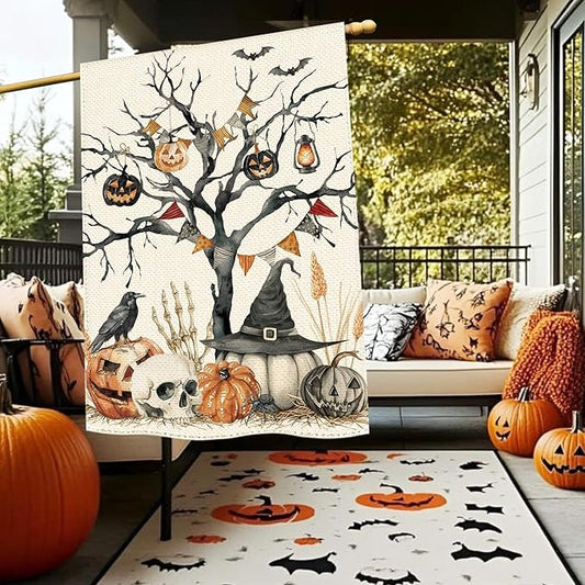 Halloween Black Tree Pumpkin Welcome Garden Flag 28 x 40 Inch Double Sided, Skull Crow Seasonal Burlap Large Yard House Flag Farmhouse Seasonal Holiday Patio Outdoor Outside Decoration