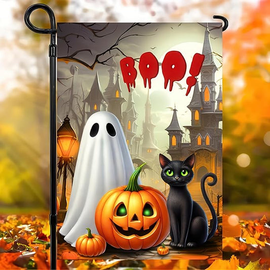 Halloween Welcome Garden Flag 12 x 18 Double Sided Decorations Black Cat BOO Spooky Ghost Pumpkin Garden Flag Holiday Yard Banner Indoor Outdoor House Décor Party
