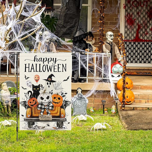 Louise Maelys Happy Halloween Garden Flag Black Cat Ghost Pumpkin Truck 12x18 Inch Double Sided Boo Holiday Seasonal Welcome Fall Autumn Small Burlap Yard Sign Outside Outdoor House Decor