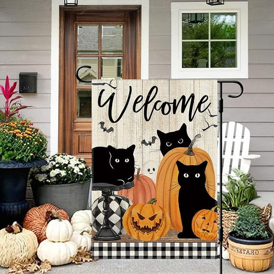 DLZDN Welcome Halloween Cat Garden Flag Black Cat Pumpkins Flag 12×18 Inch Double Side Vertical Burlap Farmhouse Yard Sign Holiday Seasonal Outdoor House Decoration