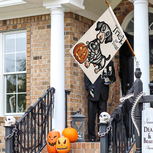 Halloween Trick or Treat House Flag Ghost Dog 28x40 Inch Large Double Sided Burlap Welcome Yard Dachshund Skeleton Outside Decorations DF342-28