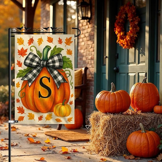 Fall Garden Flags 12x18 Double Sided – Pumpkin Monogram Garden Flag S – Fall Yard Flags for Outside Burlap, Weatherproof & Fade Resistant, Farmhouse Outdoor Décor