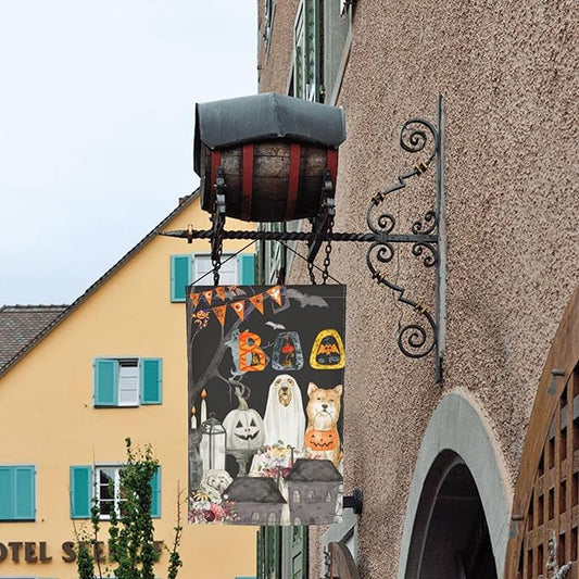 Ghost Dog Garden Flag with Jack O'Lantern Pumpkins Design Double Sided Farmhouse Welcome Decorative Small Burlap Flags 12.5 x 18 Inch for Outdoor Halloween Decor (Black)