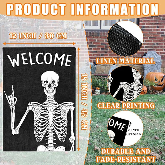 Welcome Halloween Garden Flag for Outside, 12x18 Inch Double Sided Halloween Scary Skeleton Yard Flag, Farmhouse Small Yard Flags for Outdoor Decorations, Holiday Decor Gifts-A07