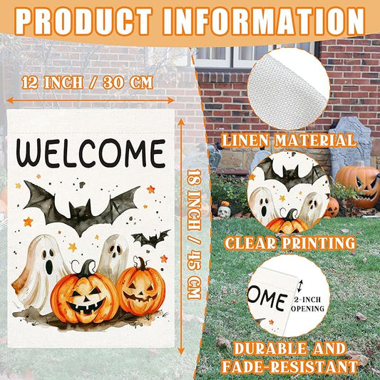 Welcome Halloween Garden Flag for Outside, 12x18 Inch Double Sided Halloween Pumpkin Ghost Bats Yard Flag, Farmhouse Small Yard Flags for Outdoor Decorations, Holiday Decor Gifts-A01