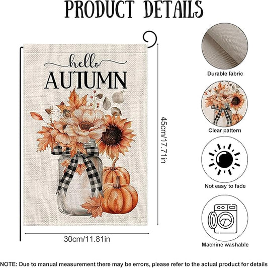 Fall Garden Flag 12 x 18 Inch Double Sided Hello Pumpkin Sunflower Maple Leaves Designs Autumn Burlap Yard Flag for Outside Rustic Yard Outdoor Holiday Home Decoration