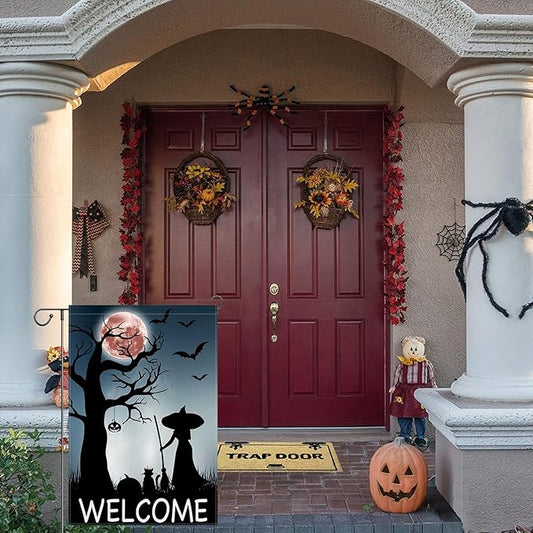 ChloropLastid Halloween Witch Garden Flags 12x18 Inch Double Sided Halloween Full Moon Night Ghost Bats Yard Garden Flags for Patio Lawn Home Outdoor Decor