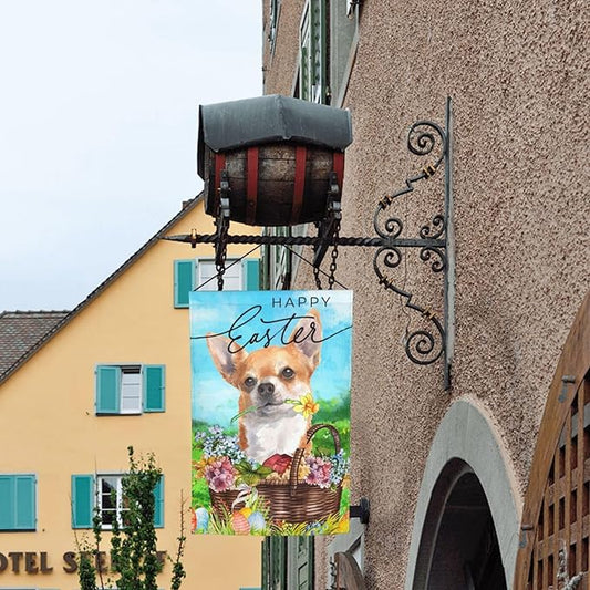 Happy Easter Chihuahua Dog Flowers Eggs Bunny Garden Flag Welcome Party Outdoor Outside Decorations Picks Home House Garden Yard Decor 12x18 Inch
