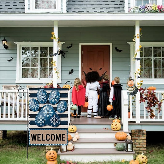 Fokongna Winter Welcome Garden Flag, Dog Paw Print Winter Christmas Decor Garden Flag, 12x18 Inch Burlap Vertical Double Sided Flags, for Home Yard Outside Decorations