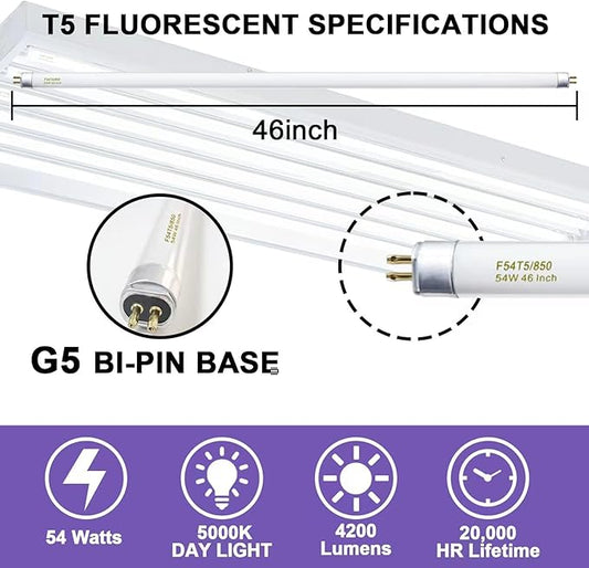 46 Inches T5 Fluorescent Bulb 54W, F54T5/850/HO 54 Watt T5 High Output 5000K Fluorescent Tube, 25 Pack, G5 Base, 4200 Lumens, CRI 82