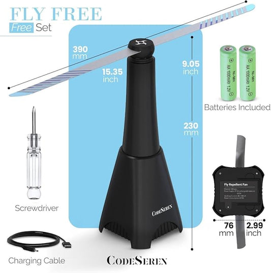 BUGGOFF Black Fly & Flying Insect Repellent Fan with Twin Blades, Table top & Hangable, Battery Powered USB C Chargeable, Cable Included. Safe Blades with Auto Stop. 4 Pack