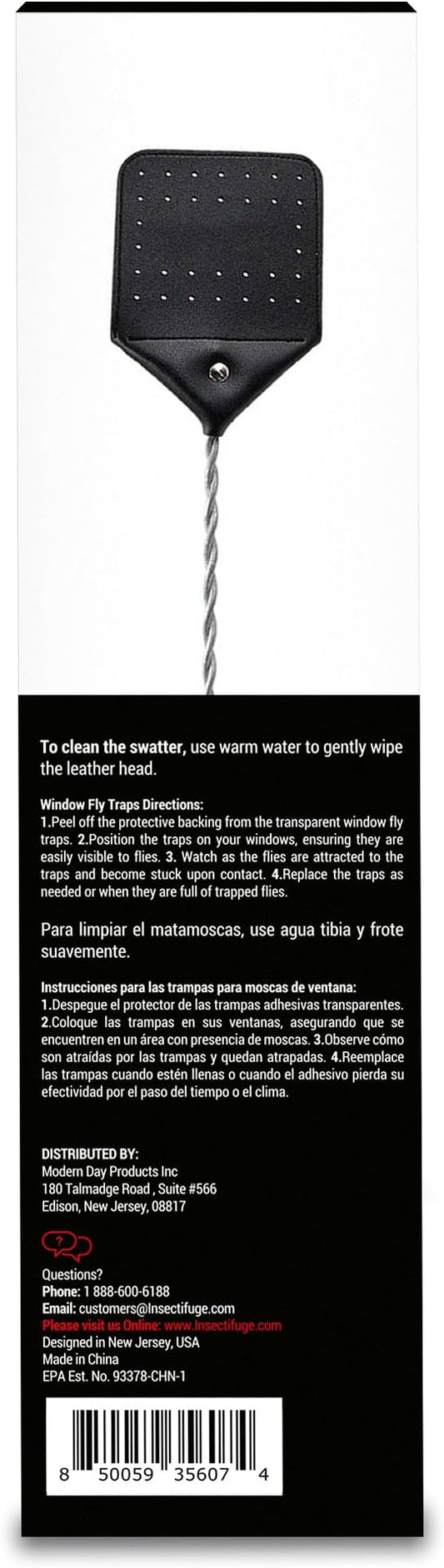 Leather Fly Swatter 2 Pack with 5 Window Fly Traps - Heavy Duty Fly Swatter Manual, Retractable Indoors Outdoors, Large Swatters Multi Pack Long Handle, MATA Moscas