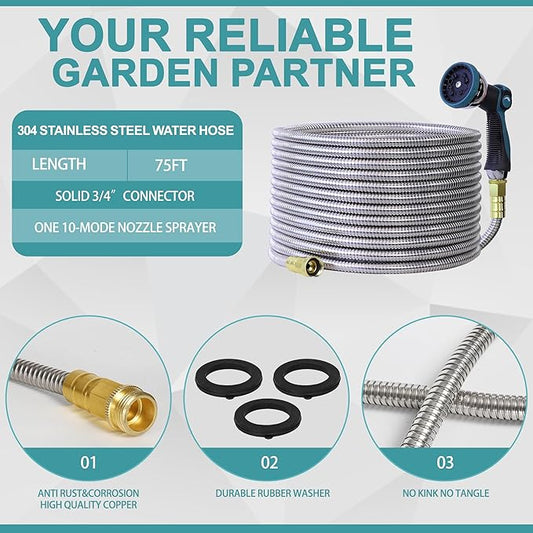 75FT Garden Hose, 304 Stainless Steel Water Hose, Flexible with a 10-Mode Nozzle Sprayer, No Kink, Lightweight, Puncture Proof, Ideal for Yard, Lawn, Outdoor, 5/8'' Outside Diameter