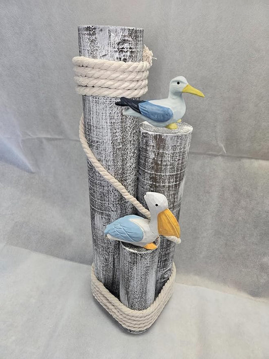 Pelican and Seagull Statue on Wood Pilings – Coastal Garden Decor, Nautical Bird Sculpture for Porch, Pool, Patio or Beach House - Marine Bird Sculpture Nautical Decor